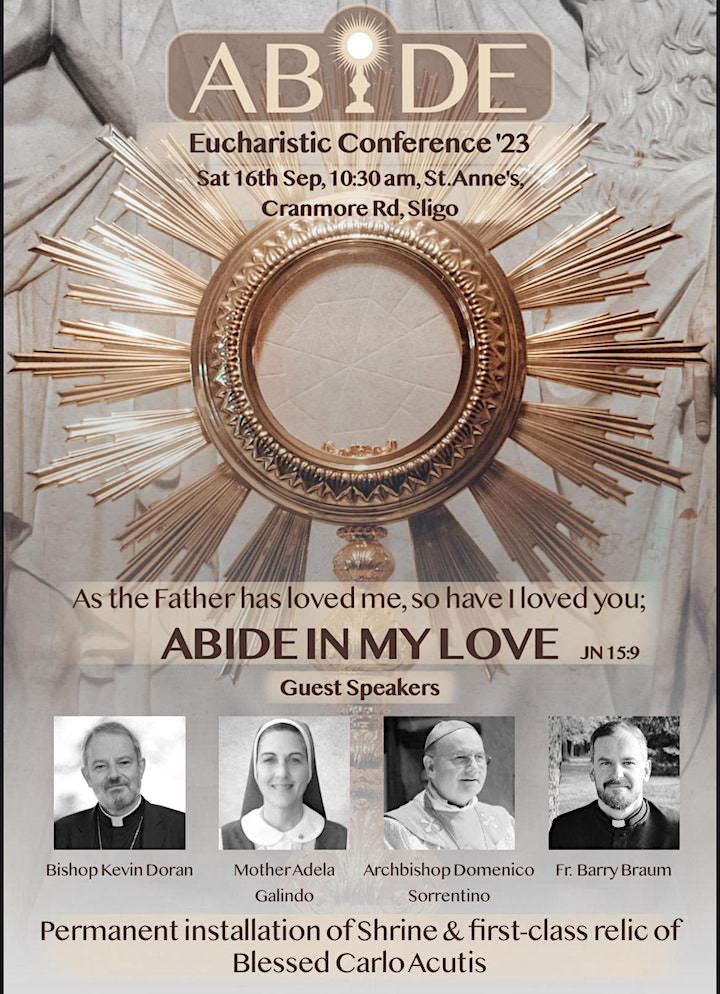 You are invited to join “ABIDE” 2nd Annual Eucharistic Conference at St. Anne’s Parish, Cranmore Road, Sligo on Saturday September 16th, 2023. This will be a day focused on celebrating and reigniting our love for Jesus Christ truly present in the Blessed Sacrament.