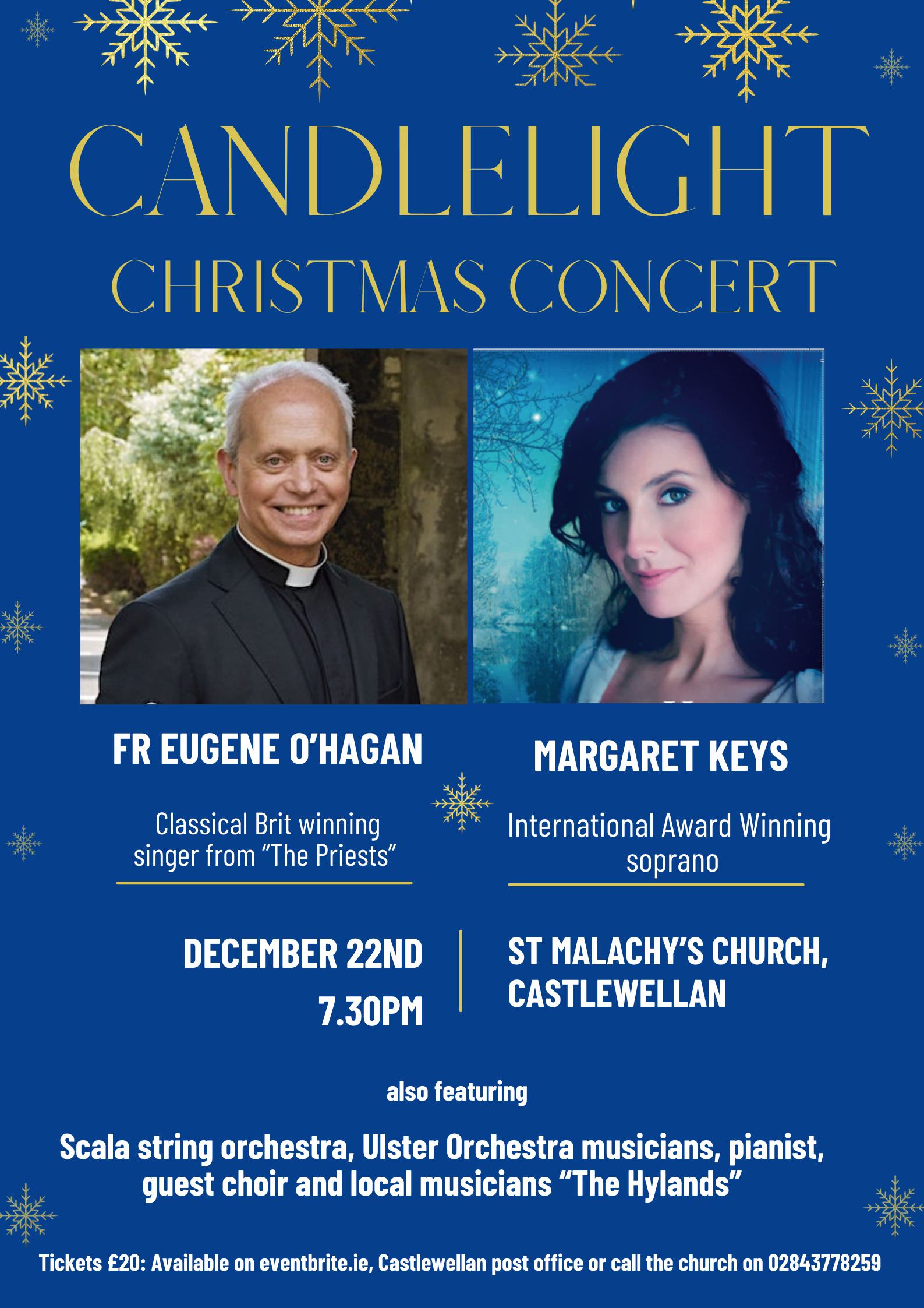 Back by popular demand join International soprano Margaret Keys and Classical Brit award winner Fr Eugene for an unforgettable Christmas concert by candlelight in St Malachy’s Church Castlewellan.