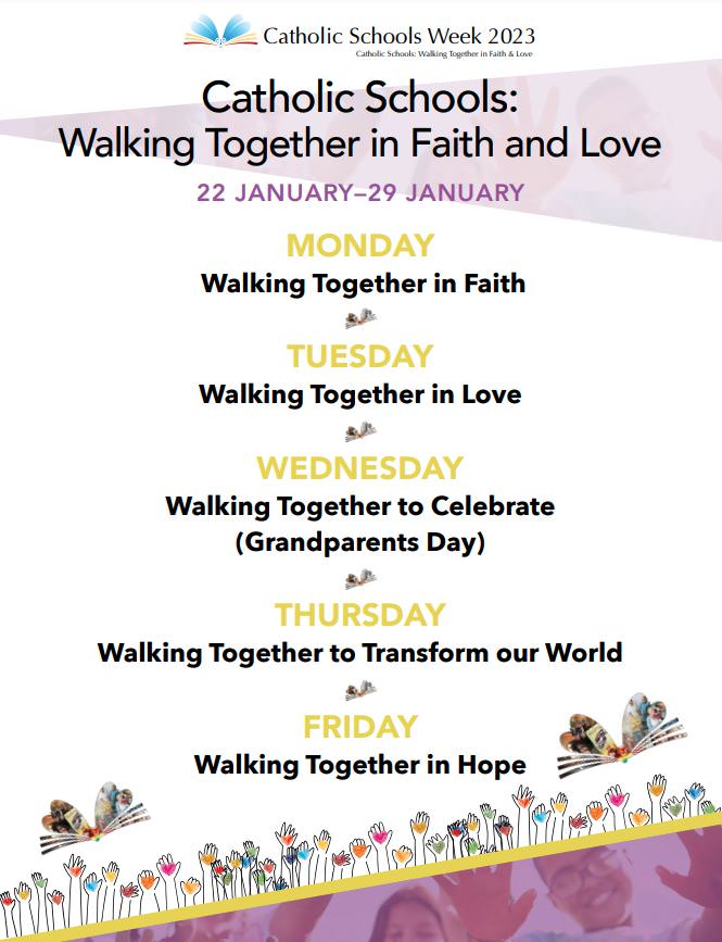 Catholic Schools will take place from Sunday 22 to Sunday 29 January 2023 on the theme of the process of Synodality, with three features of Synodality being identified as helpful to exploring ‘Walking Together in Faith & Love’: