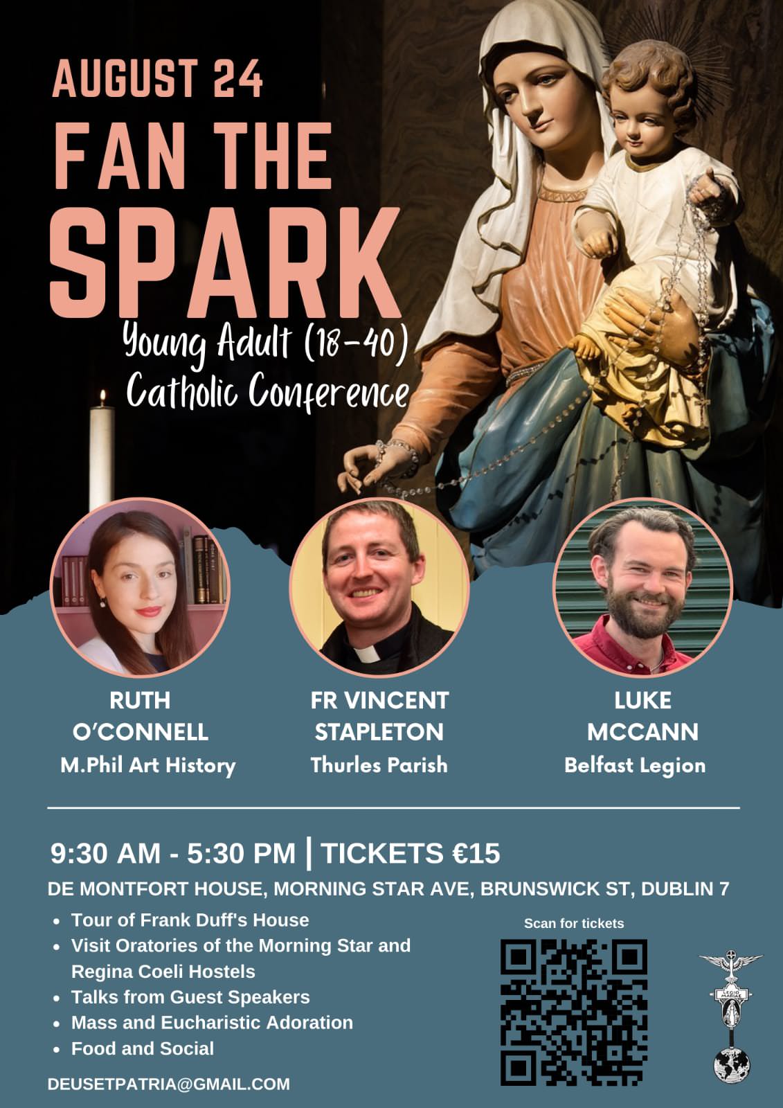 “‘Fan the Spark’ Conference for Young Adults (18-40) Saturday August 24, 9.30am-5.30pm in Legion of Mary, Brunswik St., Dublin. Cost €15. Talks on art, faith, tour of Frank Duff House, Mass, adoration and more. To book visit www.eventbrite.ie or contact deusetpatria@gmail.com.”