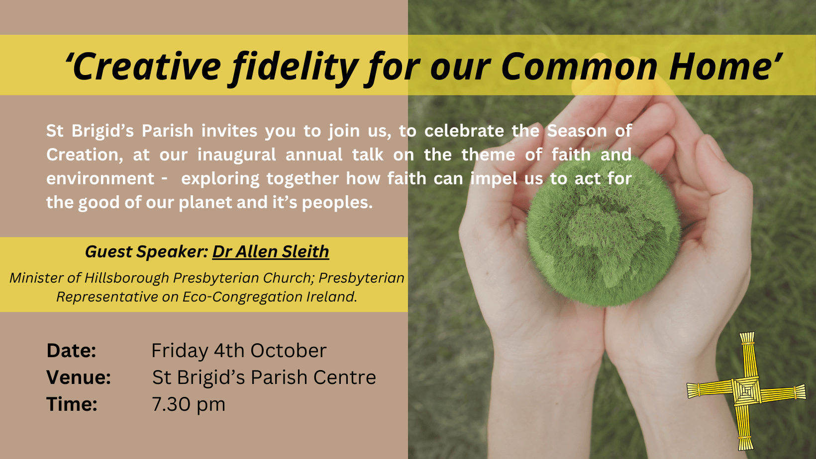 St Brigid’s Parish invites you to join us, to celebrate the Season of Creation, at our inaugural annual talk on the theme of faith and environment – exploring together how faith can impel us to act for the good of our planet and it’s peoples.