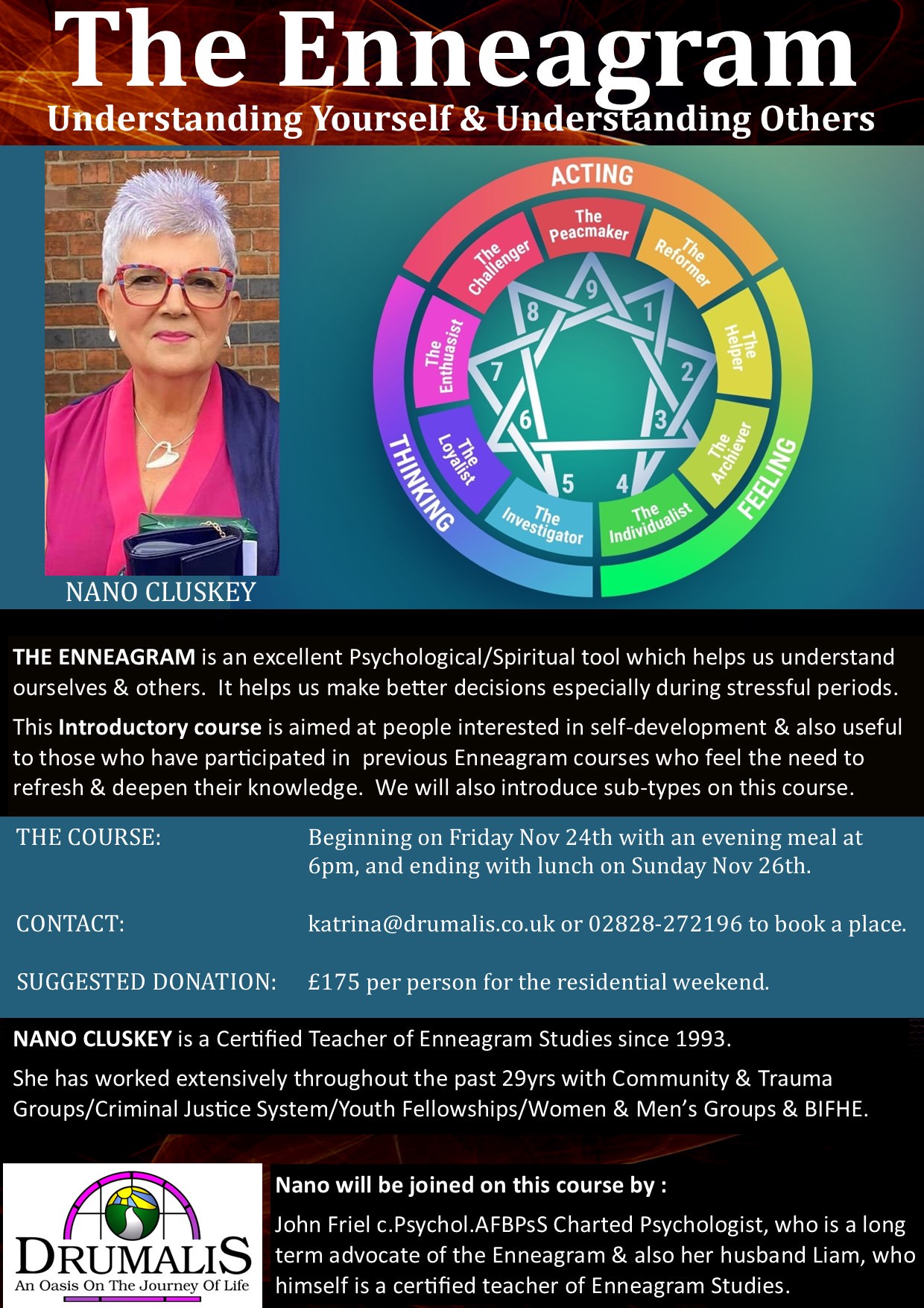 From 24-26 November, Nano Cluskey together with John Friel and Liam Cluskey will deliver a residential weekend on the Enneagram entitled “Understanding Yourself and Understanding Others.”