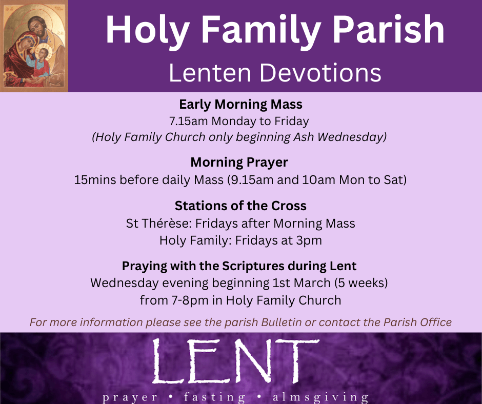 Stations of the Cross: St Thérèse Church: Fridays after Morning Mass and Holy Family Church: Fridays at 3pm.