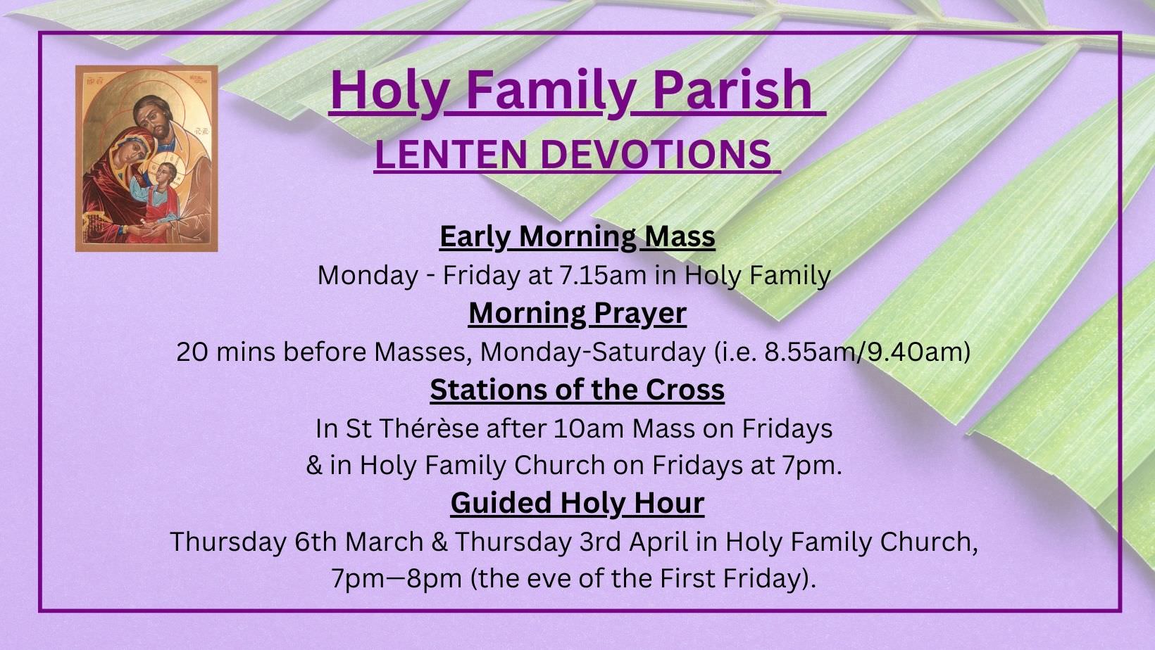 Thursday 6th March & Thursday 3rd April in Holy Family Church, 7pm—8pm (the eve of the First Friday).