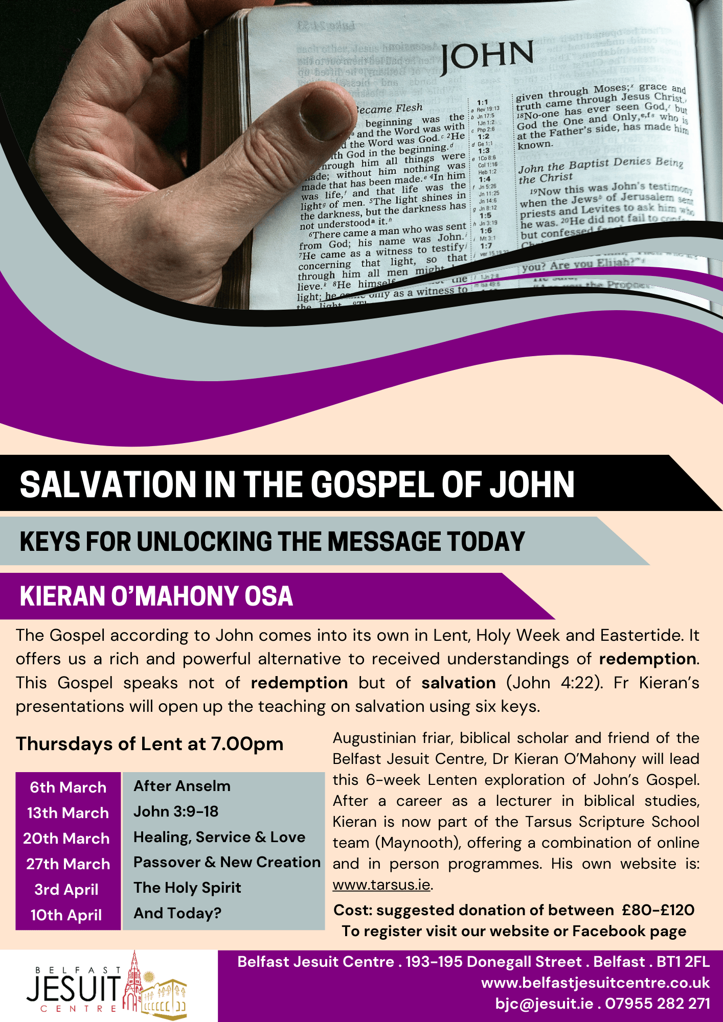 Dr Kieran O’Mahony OSA will return to the Belfast Jesuit Centre this Lent to lead a programme entitled, Salvation in The Gospel Of John: Keys for Unlocking the Message Today.