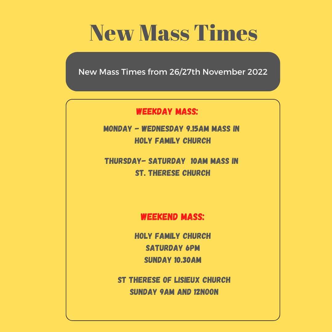 From the First Sunday of Advent (Saturday 26th & Sunday 27th November), Weekday and Sunday mass times will change in Holy Family Parish.