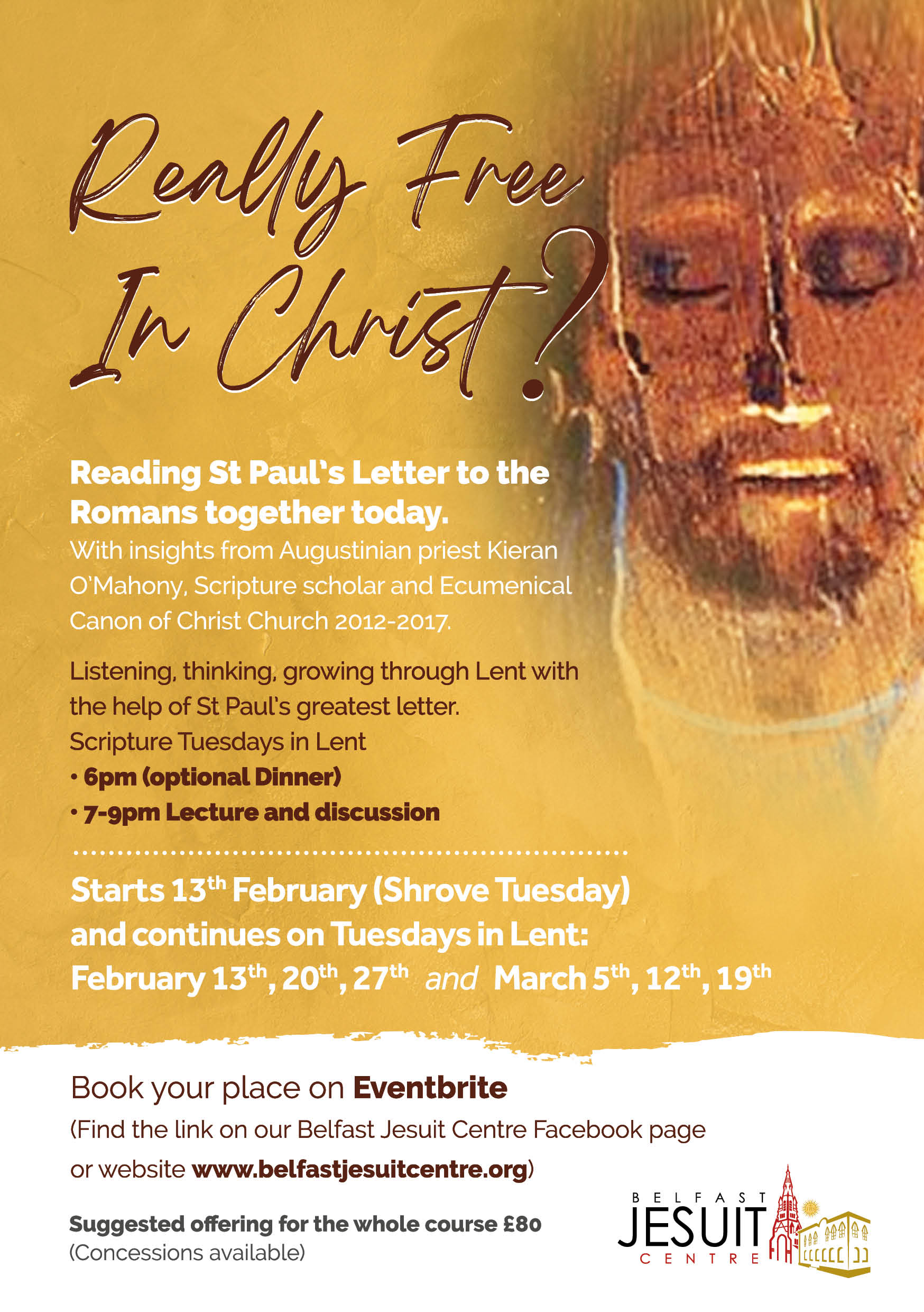 Book your place on Eventbrite ( Find the link on our Belfast Jesuit Centre Facebook page or website www.belfastjesuitcentre.org )