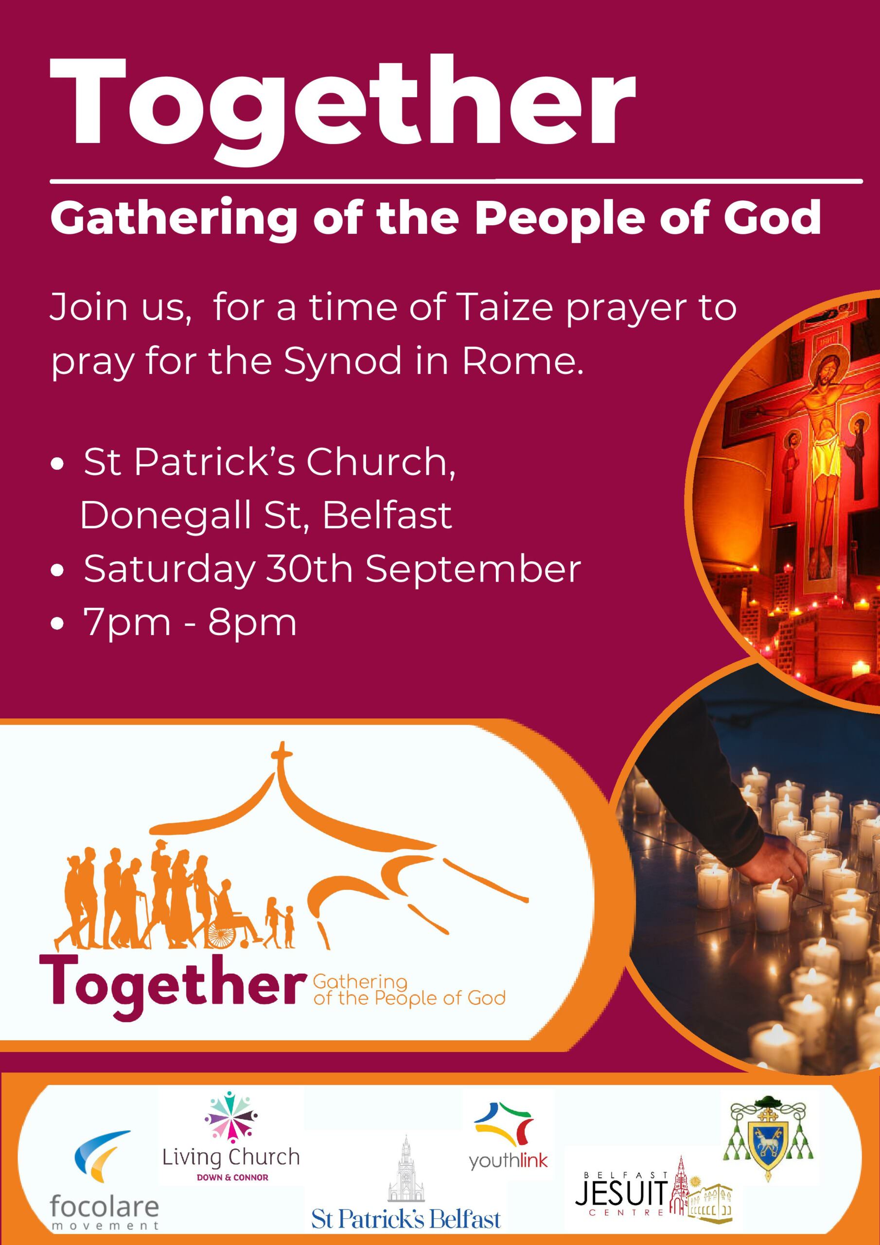 St Patrick’s Donegall St, Belfast will host a prayer service to pray for the Synod on .   This ecumenical service will include Taize music and everyone is welcome.  It is our Diocesan response to Pope Francis’ invitation to prayer:  “The path to Christian unity and the path of synodal conversion of the Church are linked. I invite brothers and sisters of all Christian denominations to participate in this “Gathering of the People of God” as we will entrust the work of the 16th Ordinary General Assembly of the Synod of Bishops.