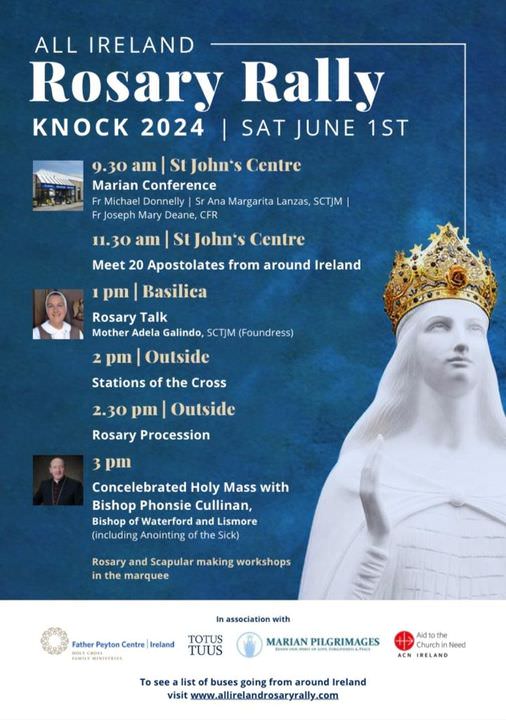 The All-Ireland Rosary Rally is an occasion for families to come together to pray and be inspired. The faithful are invited to join us on this prayer-filled occasion at Knock Shrine on Saturday, 1st June 2024. The day will start at 1 pm with a talk by Mother Adela Galindo (Servants of the Pierced Hearts of Jesus and Mary), and the Main Celebrant will be Bishop Phonsie Cullinan, Bishop of Waterford, and Lismore.