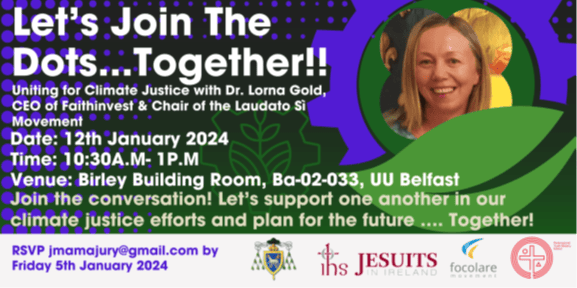 Faith groups are coming together In Northern Ireland to explore a joint approach for addressing environmental challenges, in order to enhance mutual support and develop a collaborative approach for the future. We would like to invite you to an event to further this aim on 12th January, with guest speaker Dr. Lorna Gold.